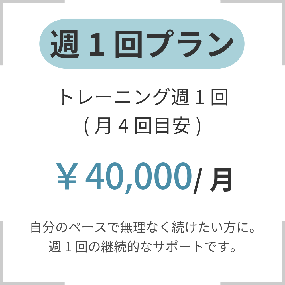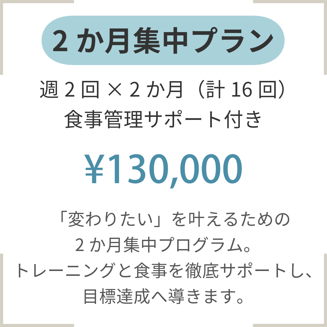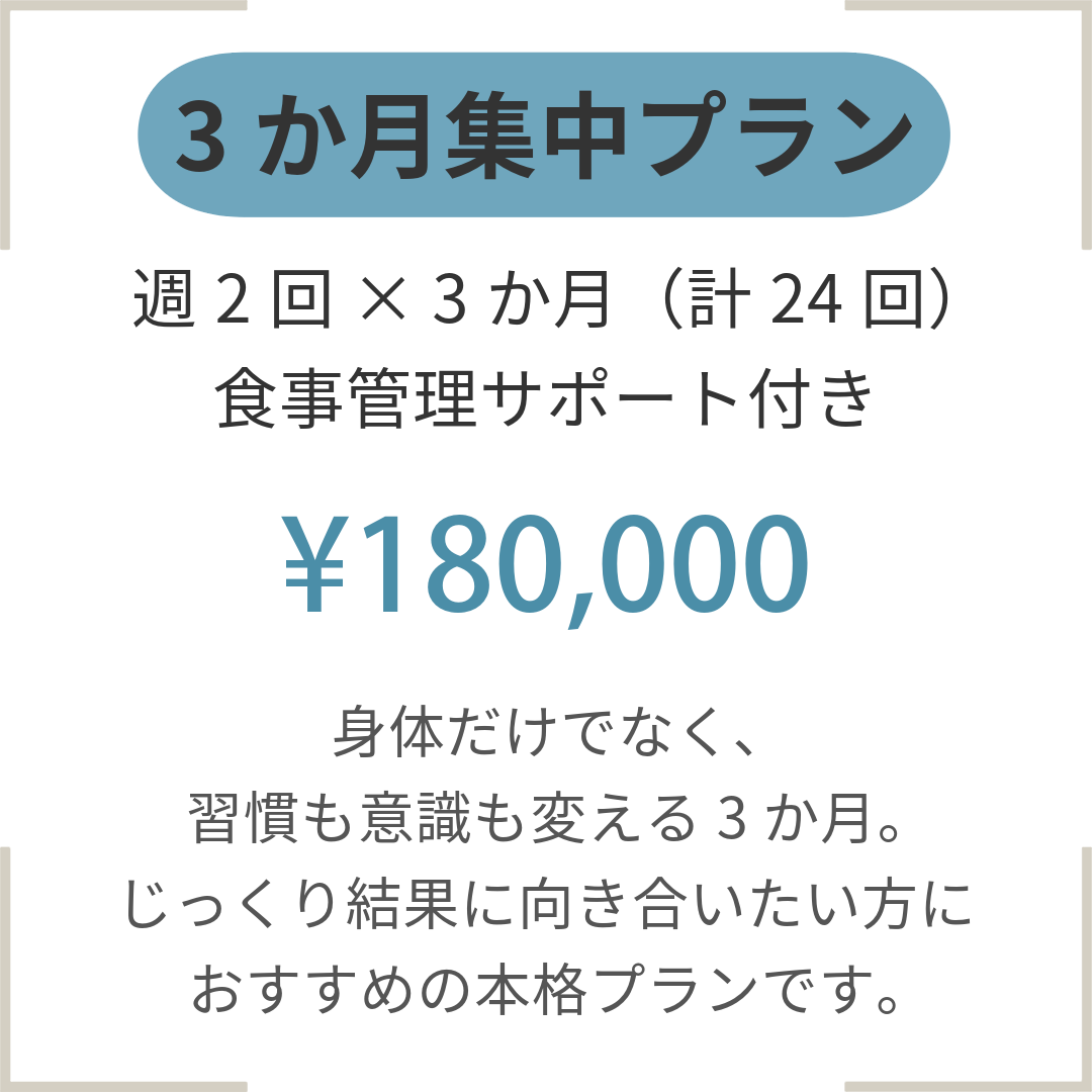 MENU & PRICE 2025.04.152026.02.26 お一人おひとりに合わせたサポートを行うため、複数のプランをご用意しています。ご不明点があればお気軽にお問い合わせください。 ※表示の価格はすべて税込みとなっております。 パーソナルトレーニング PLAN モニター価格 ※モニタープランは、最低3か月間のご契約が必須となります。 ご契約後3か月間は途中解約ができかねますので、あらかじめご了承ください。 集中トレーニングプログラム~毎月5名様限定メニュー~ 相談・お問い合わせはこちら