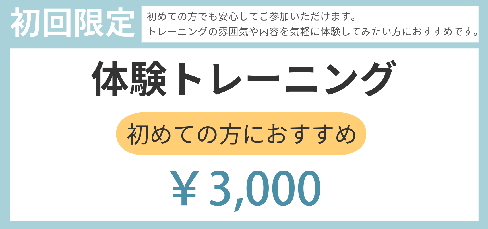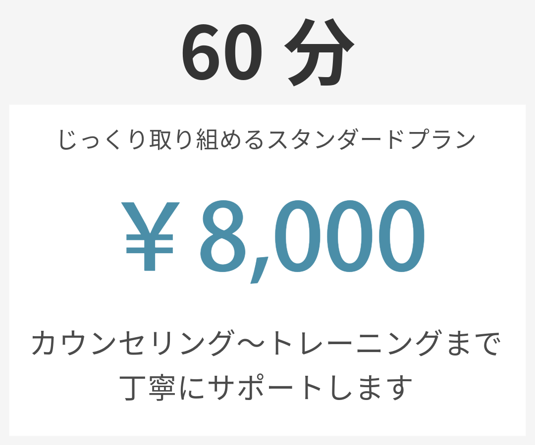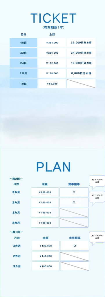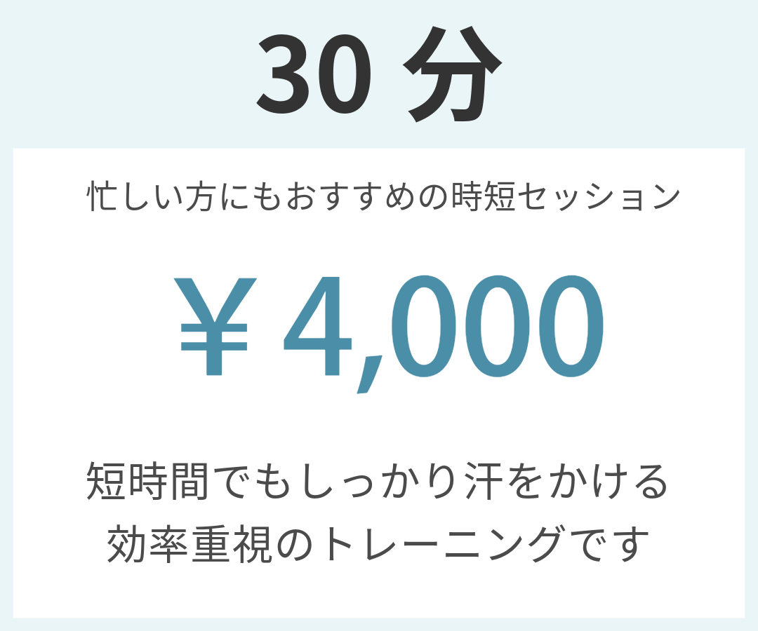 MENU & PRICE 2025.04.152026.02.26 お一人おひとりに合わせたサポートを行うため、複数のプランをご用意しています。ご不明点があればお気軽にお問い合わせください。 ※表示の価格はすべて税込みとなっております。 パーソナルトレーニング PLAN モニター価格 ※モニタープランは、最低3か月間のご契約が必須となります。 ご契約後3か月間は途中解約ができかねますので、あらかじめご了承ください。 集中トレーニングプログラム~毎月5名様限定メニュー~ 相談・お問い合わせはこちら